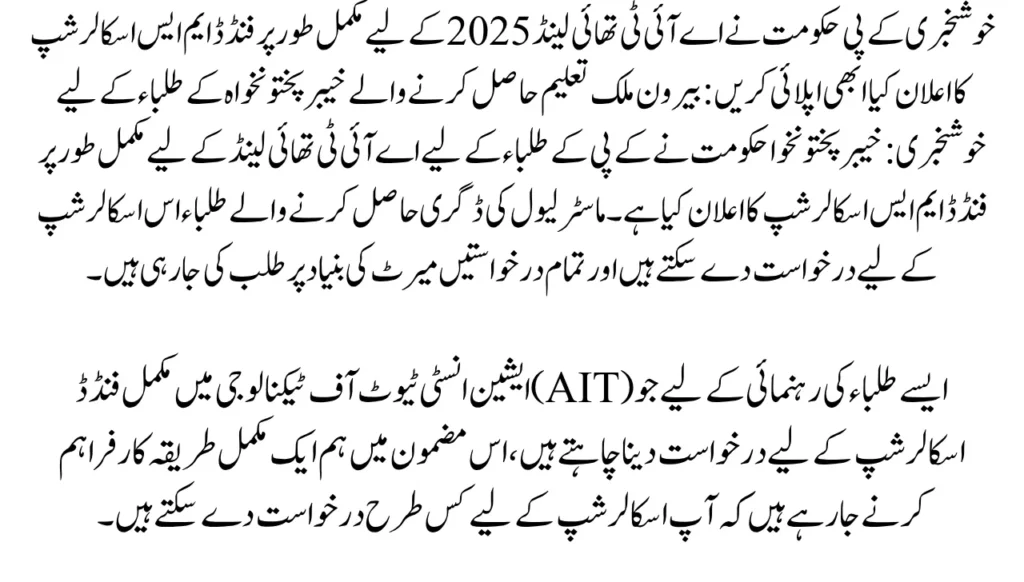 Good News KP Govt Announce Fully Funded MS Scholarship for AIT Thailand 2025 Apply Now: Good news for Khyber Pakhtunkhwa students studying abroad: The Khyber Pakhtunkhwa government has announced the Fully Funded MS Scholarship for AIT Thailand for the KP Students. Students pursuing a master’s level degree can apply for this scholarship and all applications are being invited on the basis of merit.