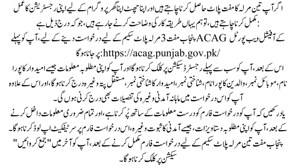 - To apply for the Punjab Free 3 Marla Plot Scheme, you first have to go to the official web portal of ACAG: https://acag.punjab.gov.pk/