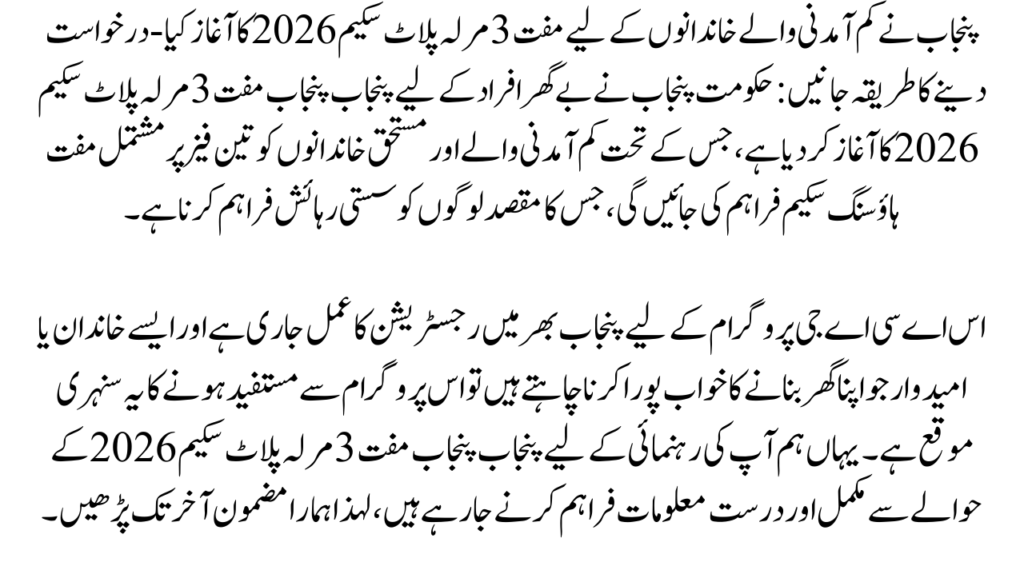 The registration process for this ACAG program is underway across Punjab and such families or candidates who want to fulfill their dream of building a house, then this is a golden opportunity to benefit from this program. Here we are going to provide complete and accurate information regarding the Punjab Punjab Free 3 Marla Plot Scheme 2026 for your guidance, so read our article till the end.